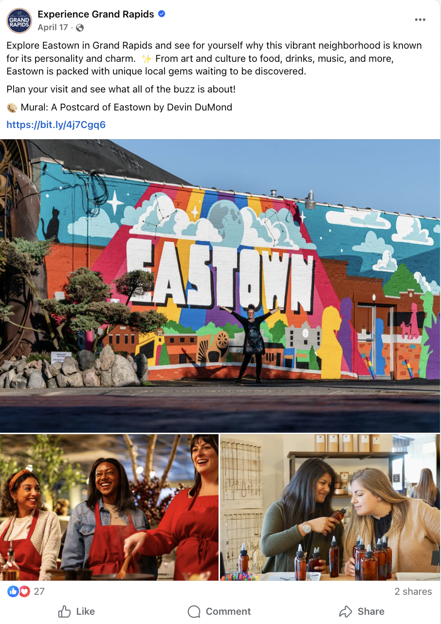 During my time at Experience Grand Rapids, I created and distributed content on 8 platforms, some with as many as 130k followers.